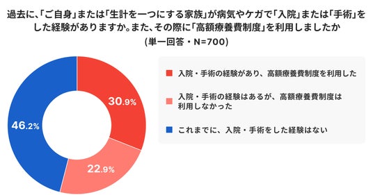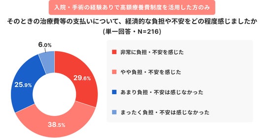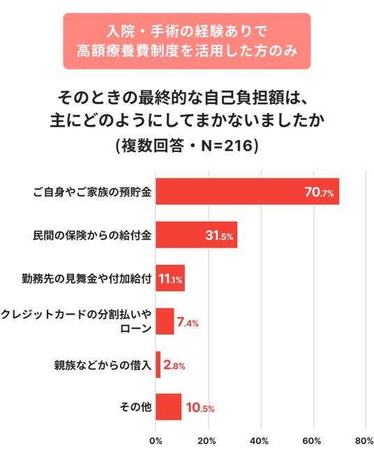入院や手術の経験の有無と制度利用状況を尋ねると、53.8%が入院・手術の経験ありで、そのうち半数以上が制度を利用していました。それでも、実際に高額療養費制度を利用した人の68.1%が、支払いに負担や不安を感じたと回答しています。支払い原資はご自身やご家族の預貯金が70.7%で最多となり、家計内資金への依存が顕著でした。民間の医療保険やがん保険の給付金を活用した人は31.5%にとどまっています。一方で、クレジットカードの分割払いやローンに頼らざるを得なかった人も7.4%いました。公的制度の適用後も一定の立替や自己負担が生じる局面があり、タイミングや支払方法が家計の流動性に影響している状況が読み取れます。制度の理解とともに、支払い手段の選択が生活への影響度を左右します。