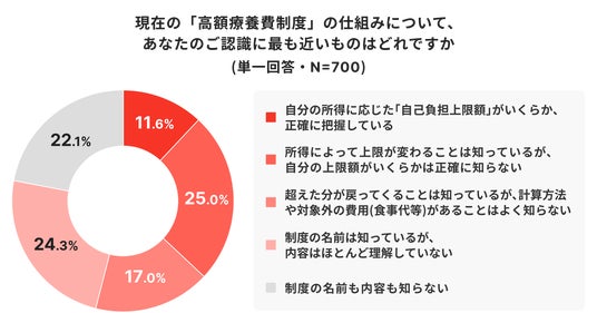 2026年からの自己負担上限額引き上げについて、改正されること自体を知らなかった人は全体の62.2%でした。現行制度に関しても、自分の所得に応じた自己負担上限額を正確に把握している人は11.6%にとどまっています。さらに、制度の名前も内容も知らないが22.1%、内容はほとんど理解していないが24.3%となり、理解不足が約半数に達しました。医療費の公的保障は家計防衛に直結しますが、実際には仕組みの理解が追いついていない状況です。制度は2段階での見直しが予定されており、今後の負担感を左右する前提情報の把握が重要になります。今回の結果から、情報接点の拡充と、所得別の上限額など具体の理解を助ける説明の必要性が示唆されます。