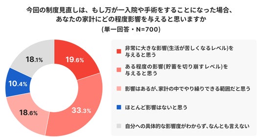 見直し後に入院や手術をした場合の家計への影響をたずねると、52.9%が貯蓄を切り崩すレベルまたは生活が苦しくなるレベルの影響があると回答しました。内訳は貯蓄の取り崩しが33.3%、生活の苦しさが19.6%です。将来の医療費負担が家計の持続性に与える影響を意識する人が多く、実効的な家計マネジメントの必要性が示されました。株式会社モニクルフィナンシャルの「ほけんのコスパ」担当者は、制度見直しの認知不足と自己負担上限額の把握の低さを踏まえ、公的保障をベースに不足分をカバーする民間医療保険の重要性をコメントしています。加入中の保険の内容確認と、医療事情に適した保障かどうかの点検を促しており、制度改定を契機とした見直しの必要性が示されました。今回の調査結果は、家計の実務対応の出発点として活用できます。