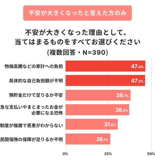 見直し内容を伝えたうえで不安の変化を尋ねると、55.8%が不安が大きくなったと回答しました。非常に大きくなったが23.2%、やや大きくなったが32.6%です。不安の理由は、物価高騰など家計への負担が47.4%で最多、次いで具体的な自己負担額が不明が47.2%でした。預貯金だけで足りるか不安という回答も38.7%に上っています。物価上昇で可処分所得が圧迫されるなか、将来発生する医療費の水準が把握しづらいことが心理的負担を強めています。