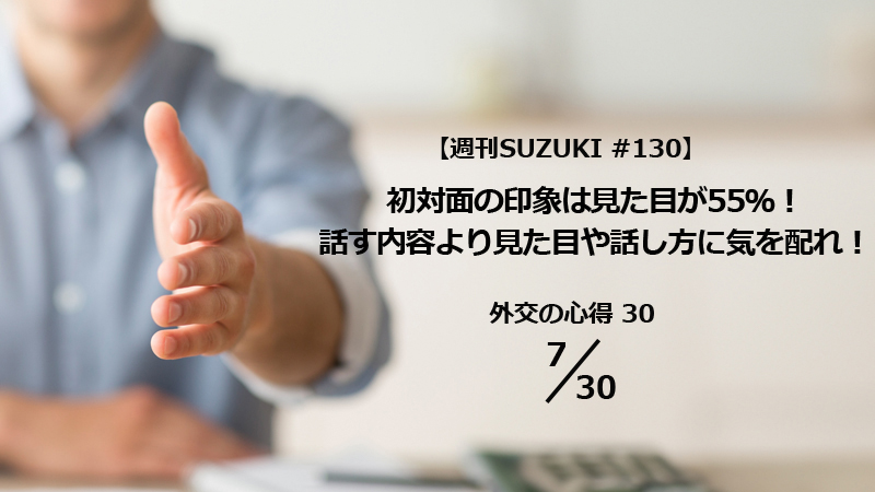 相手との良好な関係を築くためには何が必要か。多くの人が会話の量や話す内容に意識を向けているに違いありません。しかし、それらより大切なことがあります。今回は、大切なポイントを端的に示した「メラビアンの法則」を取り上げ、外交を成功に導くヒントを考察します。【週刊SUZUKI #130】