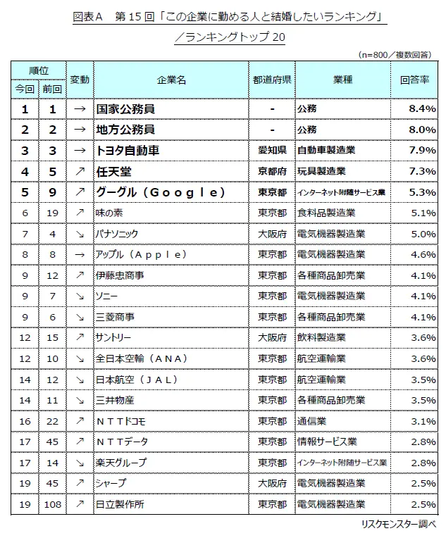 この調査によると、1位には変わらず「国家公務員」が選ばれ、2位には「地方公務員」、3位には「トヨタ自動車」が続いています。特に公務員は、過去10回にわたってトップ2に位置しており、その人気の理由は「安定性」と「給与」です。結婚を考える上で、多くの人が「安定収入」を重視していることが明らかです。