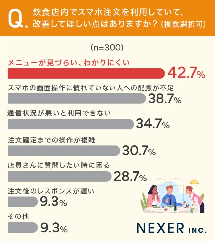 飲食店での注文スタイルが大きく変わる中、あなたはスマホ派ですか?それとも対面派ですか?最近の調査によると、スマホ注文が普及する一方で、依然として店員との直接のやりとりを重視する声も根強いことがわかりました。調査の第一弾では、飲食店内でスマホ注文を利用している方々に「改善してほしい点」を尋ねました。42.7%が「メニューが見づらい」と回答し、38.7%は「スマホの操作に不安がある」と感じています。また、34.7%が「通信状況の悪さ」も問題視しています。この結果から、スマホ注文の利便性を享受しつつ、使い勝手の向上を求める声が多いことが見えてきました。