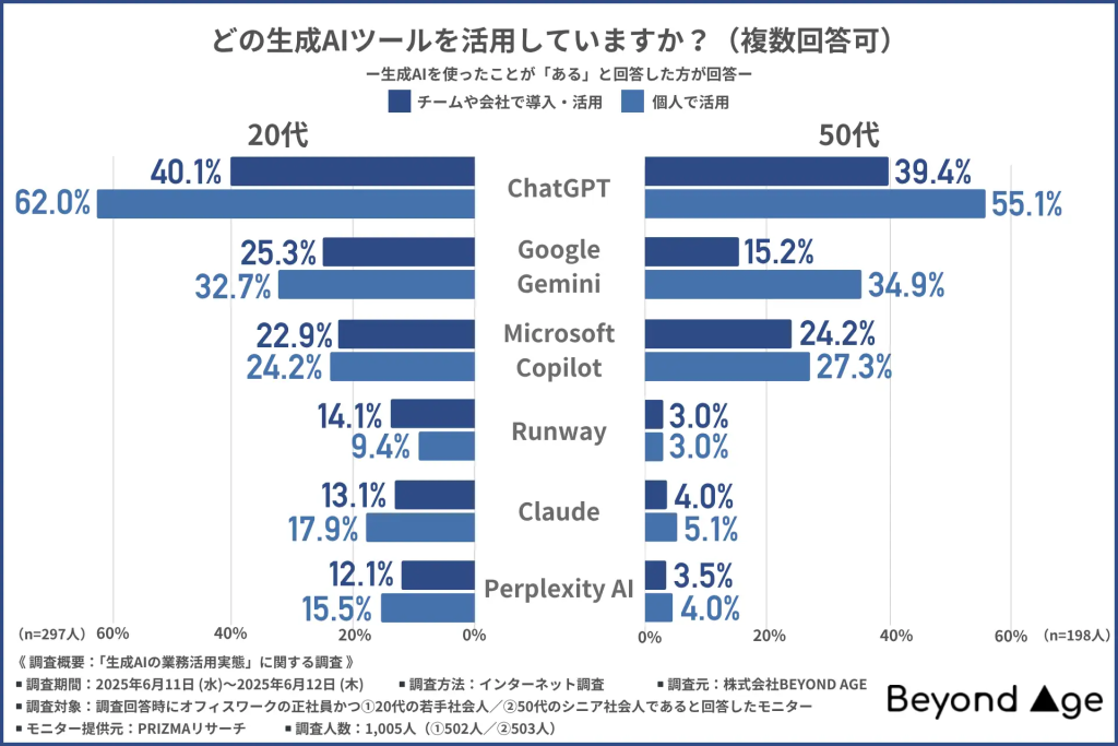 さて、世代間での活用ツールの選択も興味深いです。ChatGPTは両世代で人気ですが、20代は新興ツール(ClaudeやRunwayなど)にも積極的に手を伸ばしているのに対し、50代は大手企業系ツールに依存している現状があります。このように、生成AIの導入に対する意識や実践には世代間で大きな開きがあり、今後のビジネス環境においてその影響が出てくるでしょう。