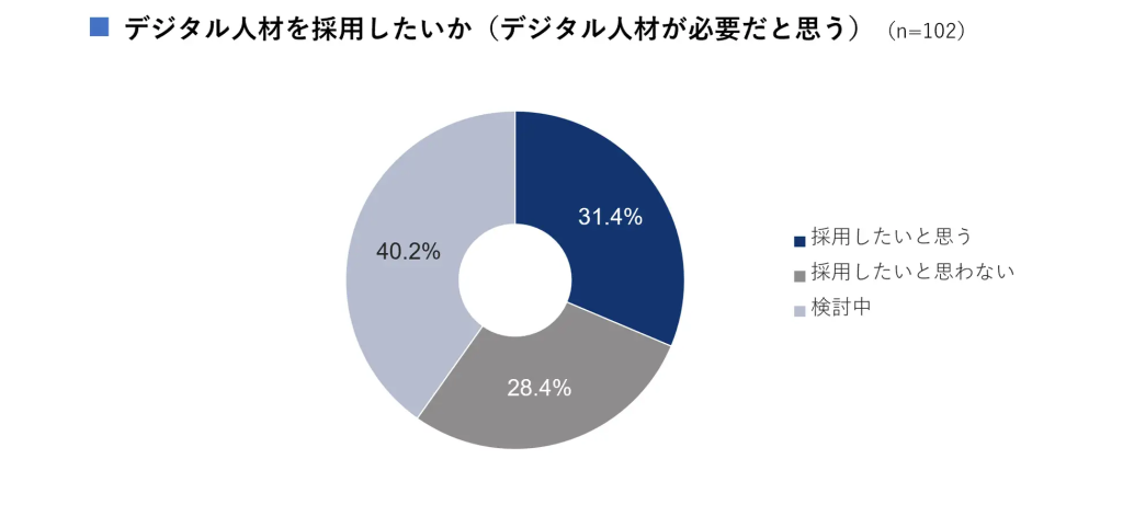 調査では、デジタル人材を「採用したい」と考える企業は31.4%にとどまりますが、40.2%が「検討中」と答えています。約72%が採用に対して前向きな姿勢を示している一方で、コストやスキルに対する不安から採用に踏み切れない企業が多いのが実態です。