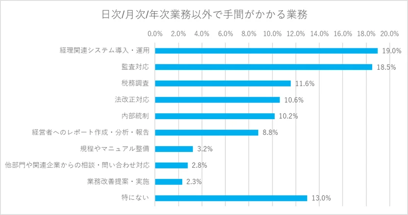 また、業務プロセス改善による生産性向上や時間短縮を期待しながらも、デジタル化が進んだ結果、逆に業務が増えている実態も浮き彫りになっています。特に「経理関連システムの導入・運用」や「監査対応」が手間を取る業務に挙げられ、多忙な経理業務の実情が見て取れます。
