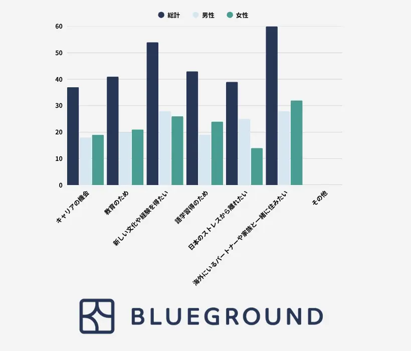 多くの人が海外で暮らしたい理由には、「新しい文化や経験を得たい」「日本のストレスから離れたい」「語学習得のため」といった自己成長を重視する動機が見受けられます。特に女性は文化や語学への関心が高く、男性はキャリアアップに強い関心を示しています。