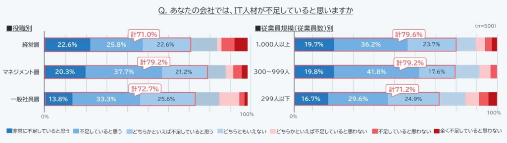さらに、IT人材不足は短期的な課題ではなく、長期的な懸念として捉えられています。多くの企業が、将来的にこの人材難が深刻化することを恐れており、特に経営層よりも現場での業務遂行に直面しているマネジメント層や一般社員層の方が、危機感を強く抱いていることが明らかになりました。