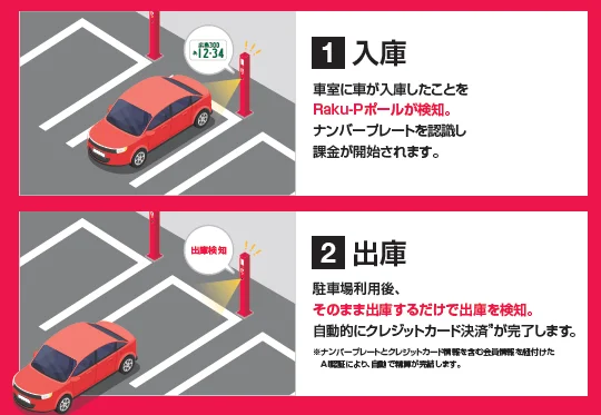 Raku-Pの駐車場予約サービスの核心にあるのは、車両認識機能を有するRaku-Pポールです。このポールは、予約した車を瞬時に認識し、入出庫時の精算を不要にします。たとえば、ユーザーが駐車場を出る際には、特別な操作をしなくても自動で精算が完了する「0秒精算」を実現しています。このシステムにより、ユーザーは従来の精算機での煩わしい手続きから解放され、ストレスフリーな駐車体験が可能です。
