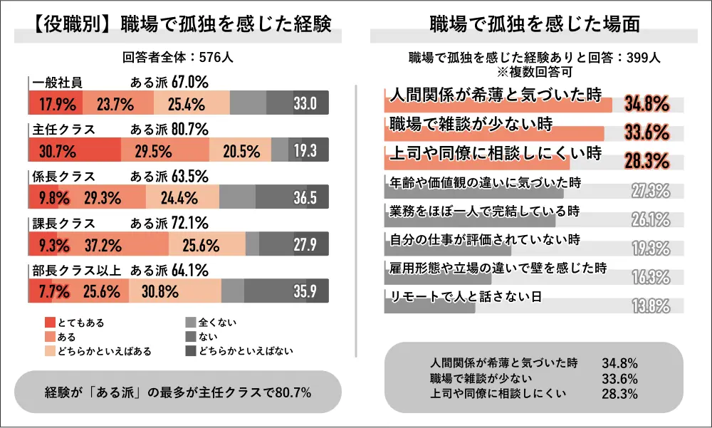 Job総研の調査によると、職場で孤独を感じた人の約35%は「人間関係が希薄だと気づいたとき」、約34%が「雑談の少なさ」を理由に挙げています。背景には、対面機会の増加にもかかわらず価値観や世代の違いが浮き彫りになり、50代・男性・主任クラスで特に顕著でした。