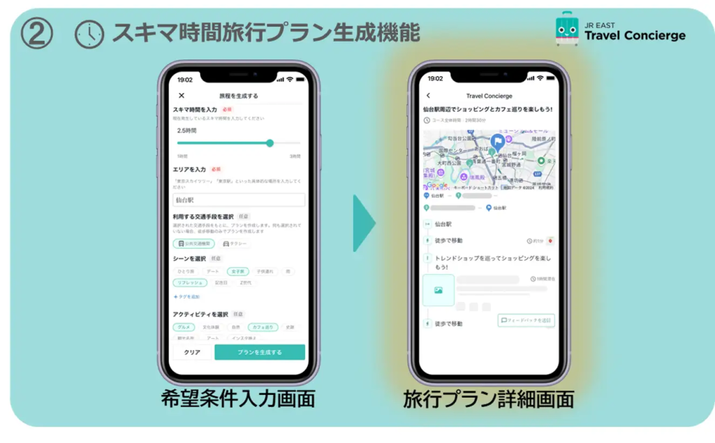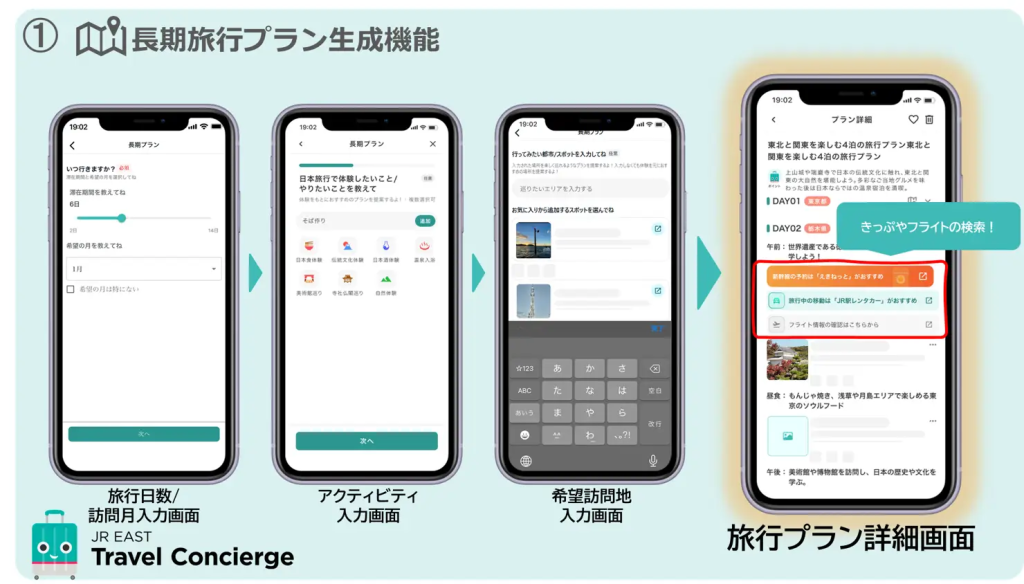 新たに搭載された「長期旅行プラン生成機能」は、ユーザーが選んだ興味や嗜好に基づいて、パーソナライズされた旅行プランを生成します。この機では、観光地の選定から回遊ルートの提案まで、個々のニーズに合わせた提案が実現されています。さらに、JR東日本グループのサービスとも連携し、スムーズな遷移を行います。