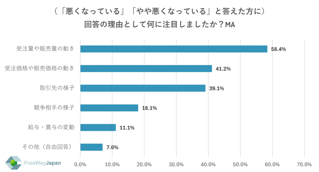 「悪くなっている」と答えた理由として最も多かったのは、受注量や販売量に関連するもので、その比率は58.4%に達しました。つまり、実体経済の動きが厳しい中、企業はどのようにして業績を維持・改善していくのかが重要な課題です。