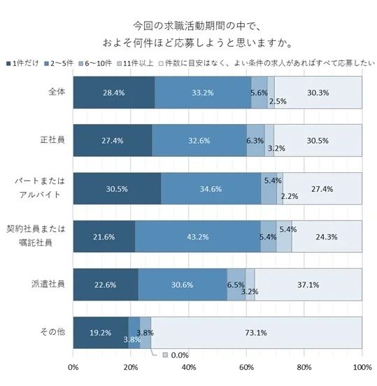 求人に応募する際の件数についても注目です。調査では、「2~5件」を選択した人が33.2%、次いで「良い条件があればすべて応募したい」が30.3%となり、応募件数には柔軟さと積極性が見て取れました。全体の約7割が複数件応募すると答えており、求職者が多角的に選択肢を求めていることが浮き彫りになります。