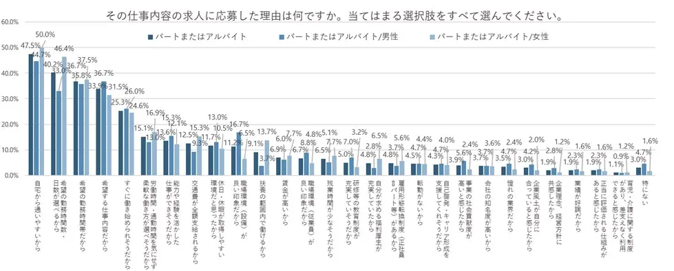 具体的には、パートやアルバイト希望者は「自宅から通いやすい」という理由が47.5%で最も多く、これが選択の根拠となっていることも見逃せません。この傾向には、生活の利便性を重視する声が反映されています。