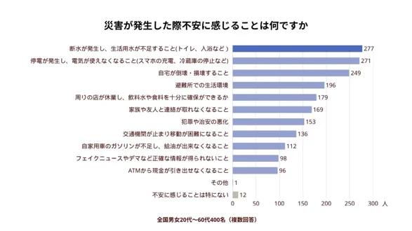 特に心配なのは、災害発生時に特に不安視される「断水」と「停電」。これらは生活基盤に直結する問題であり、実際にはどれだけ備えができているのでしょうか?