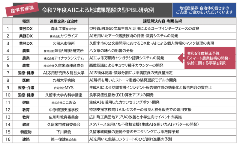 久留米工業大学と地域企業が連携して実施しているこの教育プログラムでは、学生たちが16の異なるプロジェクトに取り組みました。具体的なプロジェクト例としては、仮想空間を利用した不登校支援システムの開発や、AIによる農産物の自動選別システムの開発などがあります。