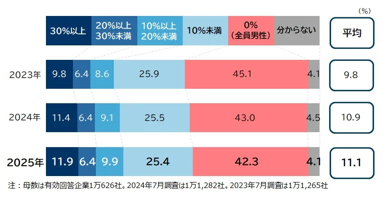 女性管理職は平均11.1%で過去最高も伸び鈍化…男性育休取得率は20%に上昇し格差が鮮明に