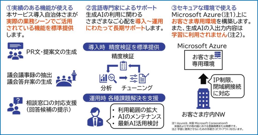 セキュリティと運用支援にも特徴があります。葛飾区での実証では、Azure OpenAIサービスとNTT東日本のManaged SD‑WANおよびクラウドゲートウェイで閉域接続を実現し、安全な通信経路を確保しました。導入から運用・データ整備まで、言語処理・AIの専門家による一貫サポートを提供し、各自治体向けに柔軟なカスタマイズも可能です。株式会社ぎょうせいからのエンドースメントも得ており、自治体の法令情報やナレッジ活用に期待が集まっています。