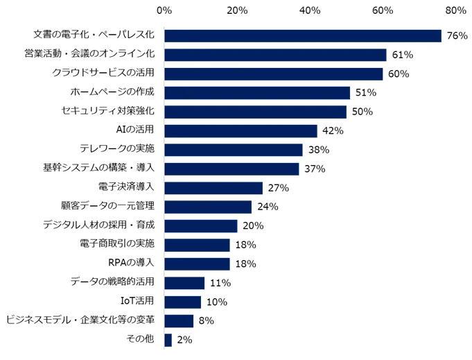 業界差が大きく、メーカーは92%が着手しているのにし、流通・小売関連は60%にとどまりました。取り組み内容は「文書の電子化・ペーパーレス化」が76%で最多です。続いて「営業活動・会議のオンライン化」が61%、「クラウドサービスの活用」が60%と、まずは業務基盤のデジタル化が進んでいます。