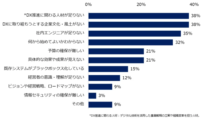 一方で、DXに取り組まない理由の上位には「DX推進に関わる人材が足りない」「企業文化・風土がない」がそれぞれ38%で並び、「社内エンジニアが足りない」が35%と続きます。
