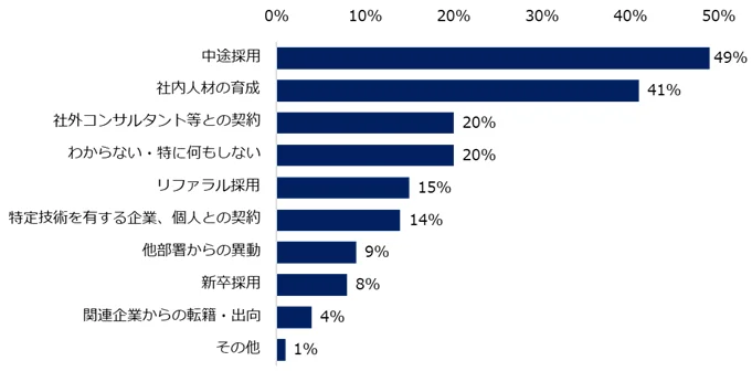 確保手段は「中途採用」が49%、「社内人材の育成」が41%で、専門部署不在や上層部と現場の温度差、退職時の引継ぎ不足、ネットワーク未整備、株主の理解不足など、採用以前の組織的課題が多く指摘されています。DXの取り組み自体は広がっていますが、人材と組織の整備が現場の停滞要因になっています。採用だけでなく専門部署や体制づくりが欠かせません。