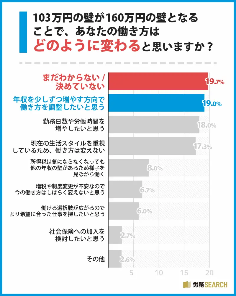 この状況を踏まえて、19.7%の回答者が「今後の働き方はまだわからない」と回答しています。逆に「年収を増やしたい」という思いを持つ人も多く、収入を増やすための方向性が見えてきています。今後、労働時間を増やす方向で調整したいと考える人が18.0%もいることから、期待感が伺えます。ただし、社会保険への加入を避けたいという意思も見られ、慎重な姿勢がいかに重要かを物語っています。