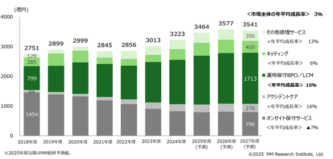 運用保守BPO(ビジネス・プロセス・アウトソーシング)やLCM(ライフサイクルマネジメント)サービスへのシフトが続いています。これらのサービスは、パソコンの導入から運用管理、保守、廃棄までを包括するもので、2027年度には年平均成長率10%で1713億円まで市場規模が拡大する見通しです。一方で、従来主流だったオンサイト保守サービスは減少傾向にあり、運用保守BPO/LCMへ契約がシフトしています。