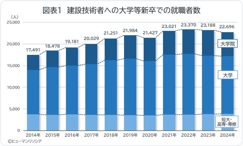 建設技術者への新卒就職者数が2014年から減少に転じ、2024年では前年比で2.1%減という厳しい結果が出ています。この数値は、長期的には深刻な人材不足を示唆しており、業界全体の持続可能性に危機感を抱かせます。特に、大学・専修学校卒の一部がこの現象の影響を受けており、建設業界は新たな採用ターゲットとして女性や文系の人材に目を向けています。