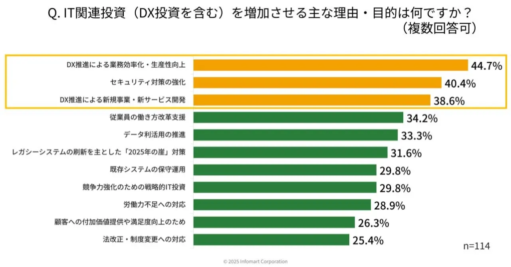 しかし、希望の兆しも見えています。約31.6%の企業が今後3年間のIT関連投資を増加させる意向を示しています。この背景には、DX推進による業務効率化やセキュリティ強化の必要性があります。