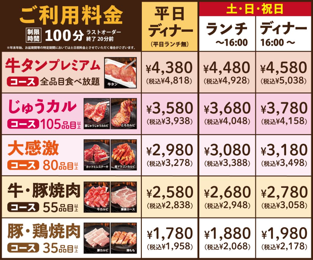 じゅうじゅうカルビの魅力は、何といっても充実した食べ放題コースにあります。「豚・鶏コース」や「牛・豚コース」など基本のコースから、「大感激コース」「じゅうカルコース」、そして「牛タンプレミアムコース」といった豪華なラインナップまで幅広く用意されています。子ども連れの家庭には嬉しい、幼児無料・小学生半額の制度もあり、シニア向けにも60歳以上の方には税抜価格から200円の割引が提供されます。さらに「わたがし」が無料で楽しめるなど、お子さまへの配慮も行き届いています。