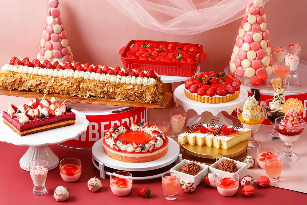 スイーツコーナーも見逃せません。5月12日までは「日替わりフレッシュいちご」の食べ放題を含む、華やかないちごスイーツが並びます。