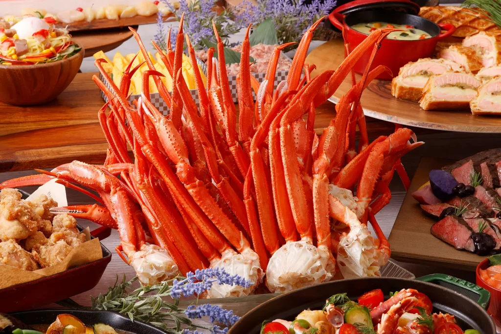 今回のフェア最大のトピックは、北海道直送の「茹で紅ズワイ蟹」を心ゆくまで堪能できる平日限定サービスです。